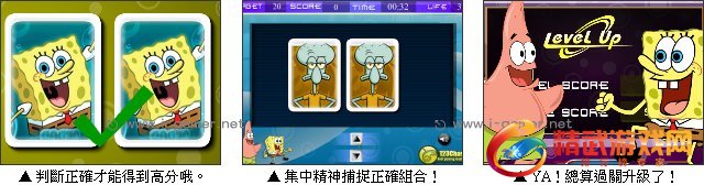 海绵宝宝与派大星正在进行一场反应力大考验,要在最短的时间找各种牌卡组合,卡片上有各种人物的图样,更换速度也非常快,注意力不集中可是会输给派大星哦,一起挑战看看吧!