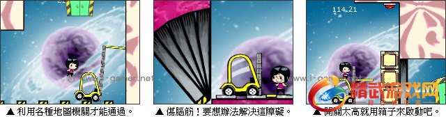 叉车小子闯关是一款益智冒险游戏,一个谜样的男孩被困在宇宙中,为了抵达关卡出口必须启动不同位置的机关开启舱门,有时候还得操控起重机举起沉重的大石,有时候要利用各种小道具开启高处的开关,聪明的你能成功帮助小男孩逃出宇宙吗?