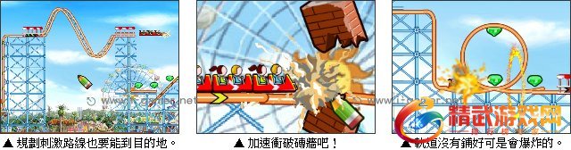 游戏操作:以滑鼠操作进行游戏,画出云霄飞车要行经的线路,灵活使用画面下方的各种轨道,它们可以帮你完成关卡。
