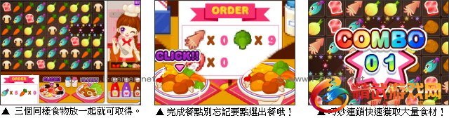 可爱的阿 Sue 成为厨师了,这次要替餐厅料理美味的菜色。客人每次点选的菜单都会将详细的食材写在下方,只要从上方众多材料中找到需要的种类就可以完成一道料理了,取得食材的方式是将他们连成一线,当数量足够就可以出餐了,所以要随时注意自己缺少的材料哦!