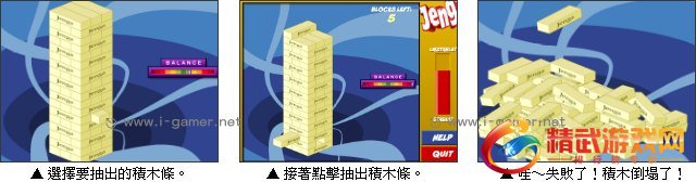 游戏操作:以滑鼠点选要抽出的积木,在适当的时候点击力度条抽出积木。
