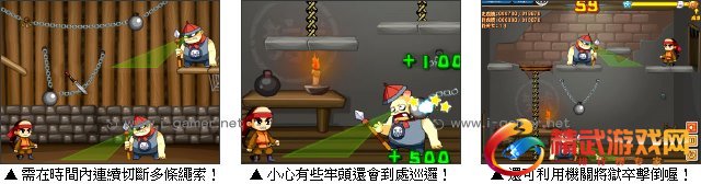 游戏操作:以滑鼠操作进行游戏,利用游戏中的道具与技巧,拿到钥匙,撂倒狱卒,救出伙伴,就可以过关了。
