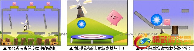 三只粉色小猪在赶走大野狼后又开始调皮啰,这次小猪们一同爬到了草堆上玩耍居然下不来,玩家们请一起来帮帮他们吧。利用滑鼠点击消除草堆,并利用物理原理让小猪们平安地回到地面上。游戏风格非常可爱,喜爱益智游戏的玩家们可别错过喔!