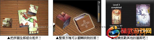 3D立体拼图比一般的平面拼图还要更有挑战性喔,玩家们要使用滑鼠或是键盘操控把画面中的拼图完成,每一款的拼图样式都做的相当精美,当你过关了等级提升难度也会增加,从原本的六个方块增加到九的个方块以此类推,看看你是不是可以拼完全部的拼图呢!
