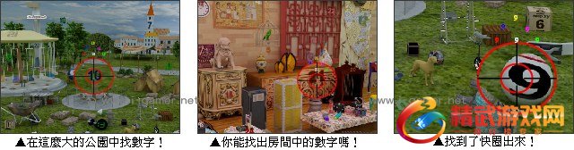 这间房间中藏着25个数字,你能够通通找到吗?有些数字在很隐密的地方喔,要仔细寻找,接着第二关来到了一个很花俏的房间,要找到全部的数字不是那么容易,第三关走出户外在一个很大的公园花花绿绿的当中你必须用心的找出所有数字,快来试试看吧!
