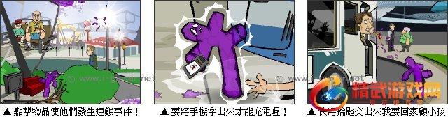 铃铃铃 ~ 电话响了,是老婆打来的电话,要他赶紧回家顾小孩陪宝宝玩,正要说到重点时手机突然没电了,但是在大马路上要怎么充电呢?游戏中玩家必须点击物品、道具或人物使他们发生作用,最终目的是将手机进行充电喔!
