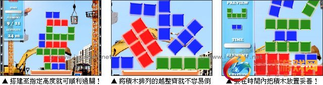 欢迎来到建筑学院,这里将提供最优秀的建筑培训课程,你只需要搭建积木到指定的高度即可顺利过关。但是在堆放积木时是有时间上的限制,还要注意放置的位置不能超出範围或让它掉到外面喔!