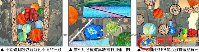 有三只可爱的小恐龙很喜欢五颜六色的宝石,他们为了蒐集宝石一起出发冒险寻宝啰。游戏中玩家需运用各种道具的特性,来让这三只小恐龙能够吃到这些宝石并且过关。但是要注意不可让和恐龙本身颜色不同的石头碰到,不然会爆炸喔!