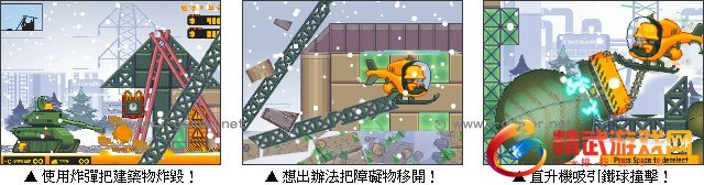 游戏操作:以滑鼠操作进行游戏,选择画面下方的炸药或道具放在适当的位置完成爆破,键盘方向键画面移动,P键暂停,R键重玩。每关的任务不一样,有爆破的,也有救人的,但是一定不能伤害到人们以及他们的建筑物哦。