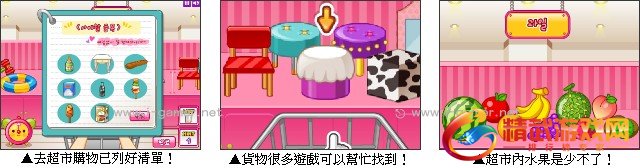买东西前是不是要先列出清单呢?没错,这款游戏已经帮你写好清单啰,玩家们必须在有限时间内在超市中找到清单中的物品,超市分成好多区,有家具、蔬菜、水果、文具 .. 等,是考验你记忆的游戏喔,右下角有的 MINT 是帮助你找到一样东西,如果忘记清单也没关係,右下角有个 LIST 点进去就是清单啰,快来购物找东西吧!