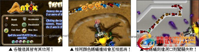 这是个消消乐类型的游戏,游戏目地是阻止蚂蚁的前进。玩家操作砲台将各种颜色的蚂蚁射到不断前进的蚂蚁战线中,让相同颜色的三个以上蚂蚁连在一起,就会互相抵消。游戏越到后面关卡会越难,可以借助不同功能的道具帮助过关喔!