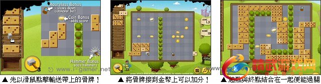 游戏操作:以滑鼠点击要输送带上的骨牌,然后在主画面上适当位置放置,空白键可以改变方向。