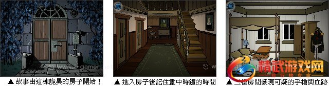 进入A房,枪那边有血渍,床边的檯灯可以点,拿走书,退出A房。