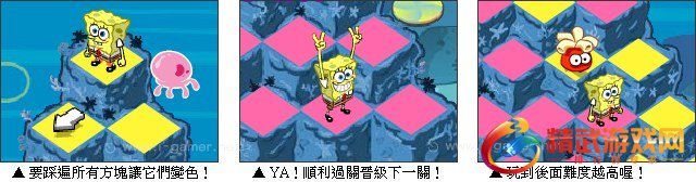 这是一款益智趣味游戏,海绵宝宝这次要挑战金字塔并且要踩遍金字塔上所有的方块让它们全部都变色就能过关晋级。游戏中偶尔空中会出现飞船,跳上去便可快速从头开始。玩到后面难度越高喔,加油!