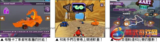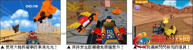 游戏操作:以键盘方向键驾驶卡丁车,空白键剎车,X 键使用技能,P 键暂停,C 键改变视角。