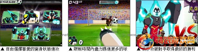 游戏中,玩家可以任意选择一种小班变身的外星英雄参加比赛,每一次比赛分为攻防两场,皆有时间限制,攻击时,玩家需要操控小班踢球攻破对手球网得分,并且出现数字提示时,踢中还能有加时奖励唷!防守时,则是拖曳小班用全身阻挡对方进球,时间结束以得分多者为胜!小班需要依序将包含魔贾斯在内的对手全数击败,才能取得最终胜利,玩家快来帮帮他吧!