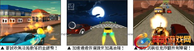 觉得前方堵塞,行进困难吗?除了守规矩的切换车道外,玩家也可以考虑利用撞击或是坦克车的大砲功能,直接将前方障碍通通扫除唷!在游戏中,撞击并不会使车辆损毁,只会造成车速降低,所以唯一能使玩家止步的,就是油箱耗尽啦!左上方的进度条会显示车辆距离恢复线(补油区)还有多远,玩家可视情况催动氮气加速来换取一线生机!现在就来展现一下你的路霸气场,鸣响喇叭,全速前进吧!