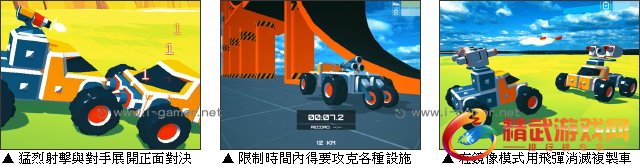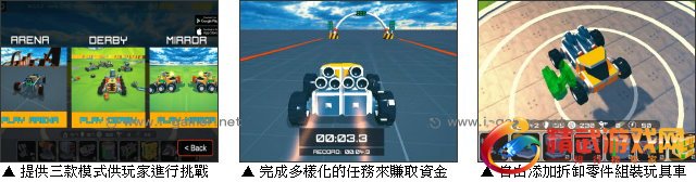 想要的太多,手边的经费太少吗?游戏也提供了充满各种艰难任务的挑战场或是与其他对手较量的竞技场!前者,玩家需要操控玩具车在限制时间内进行加速测试或在各种装置中展现巧妙的特技驾驶技巧!只要成功完成,就能获得金额不定的奖励喽!至于充满火药味的竞技场模式,玩家则可以选择与其他对手或是与由电脑操控的复制车来场对决,确认在相同条件下,谁才是真正的玩具车战斗大师!而获胜的方式很简单,玩家只要利用各种机枪或是火箭炮将对手彻底粉碎就可以啦!现在就来发挥你的创意,体验这款令人上瘾的设计游戏吧!
