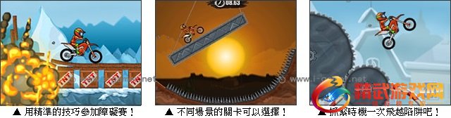 游戏操作:以键盘上下键操控摩托车前进∕剎车,左右方向键控制重心,P 键暂停,R 键重玩,空白键继续。