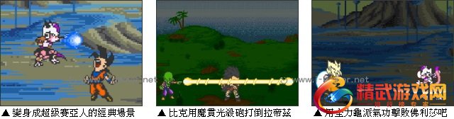 游戏提供了 16 个角色供玩家选择,悟空、悟饭、比克、贝吉塔、人造人、佛利莎、赛鲁等等。不同的脚色的招式也不尽相同,经典的龟派气功、气圆斩、魔贯光杀砲到加力克砲应有尽有。赛亚人、佛利莎、赛鲁等人还可以进行变身。燃烧你的龙珠魂吧!
