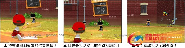 一款不错的棒球小游戏,人物可爱,画面美观。你挥棒打到捧球,如果飞得够高,打到墙上的全垒打线以上,就可得4000分的全垒打分数。如果打击出去的方向,穿越(X2)的宝物,分数会加倍。若是被防守球员接着或被投手三振出局的话,分数会大幅下跌。