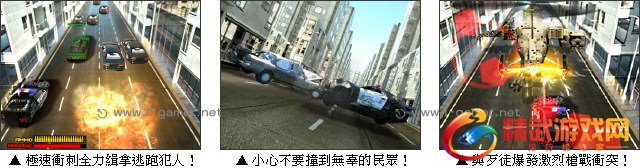 游戏操作:以键盘 ←→ 键或 A、D 键操控警车左右移动,↑↓ 键加速减速,空白键射击,R 键换子弹,数字键 1、2、3 键切换警笛声音。
