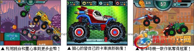 刺激的怪兽大脚车锦标赛登场啰,在充满障碍又高低不平的赛道上横冲直撞的通过是多么畅快的事情。过程中玩家要仔细的控制大脚车的重心,使用各种特技,利用跳台进行跳跃、翻转等,才能够击败其他的竞争选手。游戏的关卡难度会不断提升,必须利用比赛赚取的金钱来升级大脚车的配备,考验你驾驭技术的时到了,快来挑战看看吧!