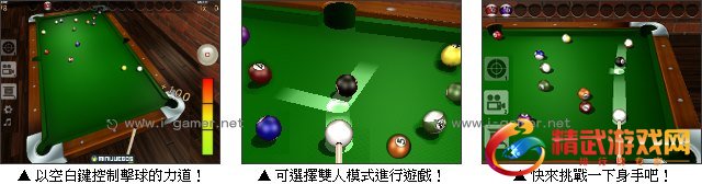 这是款超逼真的 3D 花式撞球游戏,游戏可分成两种游戏方式,一种是时间模式,玩家得要在时间内将球台上的球给清完,另一种是双人游戏模式,可以和好友一起同乐,不管是单人游戏或双人游戏,都可以让玩家感受到游戏的挑战性。不同的击球点,不同的力道,若控制得当,还可以一竿清台喔,游戏中随时可切换三种视角,可让玩家享受不同角度打击的快感喔!