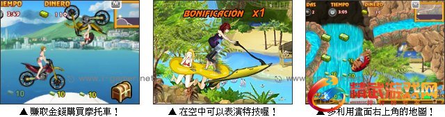 游戏操作:以键盘方向键操作越野车移动,空白键跳跃与特技,X 键加速,P 键暂停,M 键显示 / 关闭小地图。