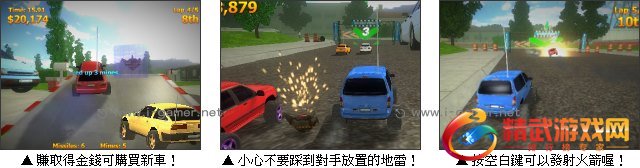 游戏操作:以键盘方向键操作移动,空白键发射导弹,C 键放地雷,R 键重置赛车,Shift 键前面视角,Tab 键切换视角,Esc 键暂停游戏。