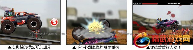 特技四驱车是一款很经典的游戏,游戏开始你必须要操作这台四驱车通过许多障碍物,最重要的是要保持平衡,翻车就会爆炸就要重来一次了,这次游戏中多了以人为障碍物的设计,遇到也是直接撞过去,画面有点血腥,不过也相当具有挑战性。