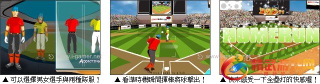 游戏操作:以滑鼠移动球棒,按空白键让投手投球过来,在适当的时机按滑鼠左键挥棒便可。快来感受一下全垒打的快感喔!