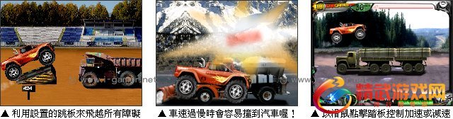 游戏操作:以滑鼠操作进行游戏,点击右下方的摇杆控制四驱车加速和减速。