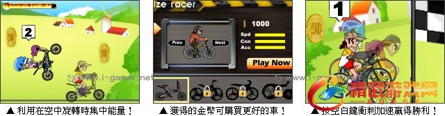 在晴朗的午后有一场自行车竞赛将要进行,这个竞赛有多段赛程,选择一辆自己喜欢的自行车去参加竞赛吧!游戏中玩家要跟其他几位选手进行比赛,为了取得胜利可利用在空中旋转时集中能量,再使用空白键来加速,就可以很快的超越对手!
