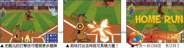 最近史酷比爱上了棒球运动,于是牠和朋友参加了一场棒球比赛,但是史酷比的技巧似乎还不够纯熟,现在就请玩家们来帮帮牠吧。游戏中只要将球打击出去就可以累积力量,到达一定程度时还可以打出 HOME RUN 喔!