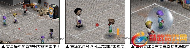躲避球是一款球类游戏玩法很类似之前的打雪战游戏。游戏规则是尽量躲避以免你的队员被对方的球击中,并且要想办法用球将对方球员一个一个击倒。当对方球员有像气球一样的防护罩时是无法击中的,集满气后 (滑鼠右键按着队员待集气条补满后) 再发球可以增加攻击强度!