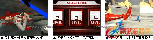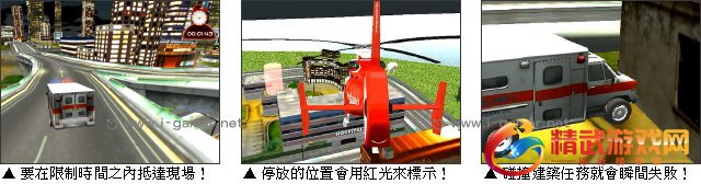 在每个任务的开始,游戏都会播放一段患者的影片及说明,而在之后,就是玩家大显身手的时候啦!在画面的右侧,玩家可以确认当前剩余的时间,以及最重要的,一个标有目标位置,但却只能确认东南西北的小地图!接着,玩家就得驾驶各种救护载具,试着用最快的速度找到待救援的对象,并确认救护人员将目标搬上车吧!当然,上车之后也不是结束唷,玩家还得找到指定的医院,并安全驾驶,没有发生任何碰撞的送抵,才能完成整个救援任务呢!现在就捲起衣袖,好好挑战一下吧!