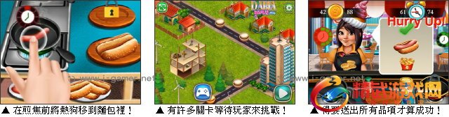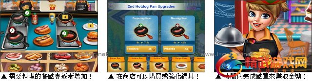《汉堡热狗快餐店》是一款经典的时间管理游戏,在每个开张日子前,玩家都会接到今天的任务,例如要赚取多少钱,可以使用的时间等,而在之后,玩家就得发挥协调分配的能力,在外场耐心用尽前,观察上报的点单,并逐项料理!不过只有整单完成,才能正确出餐并且赚取金币唷,做到一半就发火离开的话,之前的也就浪费了呢。另外,每天结束,玩家可以用刚刚赚到的经费,购买新的锅具或是强化现有的,让它加热的更好,完成的速度更快!随着成功度过的日子越多,料理台和菜单上的品项也会越来越丰富,玩家动手出菜前可要镇定下来,别看花了眼,让顾客等太久喽!