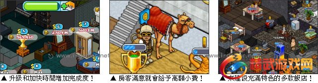 在游戏中,玩家需要陆续完成五个地图,而在每个地图的开始,都能先解锁一块最便宜的房间!而后续发展的费用也就来自于此啦,藉由其中摆放的设施,玩家每经过一段时间,就能点击获得一定金额的收入!若想要收穫得更快或是一次收取更多金币,玩家就需要耗费之前累积的经费,点开升级模式强化设施唷!另外,这些设施在经过一定的升级之后,还会变换外观或是增加自动收集的功能,玩家可以多多尝试!看见进驻饭店的房客了吗?只要他们觉得满意,就会一次给予高额的小费唷!玩家可不要错过啦!