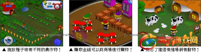 游戏中你可以经营四块土地和一个养殖场,首先要购买种子,然后配合工具栏中的工具进行播种、浇水,接着到屋子里休息,等到第六天就成熟可以收成了,最后把收成的农产品拿到商店卖掉,随着累积资金成长,可以耕种高附加价值的作物来累积自己的财富。玩家们来体会劳作的快乐和丰收的喜悦吧!
