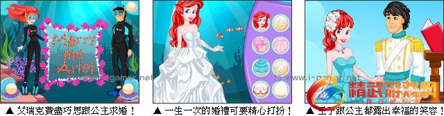 艾瑞克王子在秘密计划给人鱼公主一个浪漫的求婚,为了这一天王子需要你的帮助,完成这场惊天动地的婚礼让公主难以忘怀。游戏中王子与公主相约在海中游玩,王子秘密安排鱼儿排出求婚场景,面对心爱的女孩单膝跪地,捧着戒指深情表白,让大海见证这场美妙的爱情。在这浪漫的时刻,你要为王子与公主好好打扮一番,让在场所有的人将铭记终生。