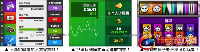 游戏操作:以滑鼠操作进行游戏,点击升级 / 增加收益。