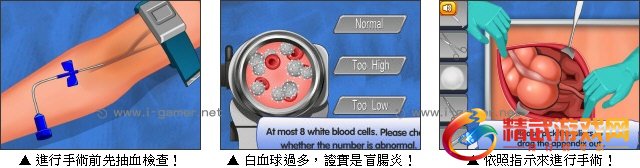 医院来了一位病人,直喊肚子痛,原来是吃到不乾净的东西,引发了急性盲肠炎,你必须帮她动手术做紧急处理才能让她回复健康。在游戏中玩家将扮演一位医生,依照指示完成步骤,首先先抽血检验,接着将盲肠切除并缝合伤口。准备好了吗?现在就进开刀房动手术吧!
