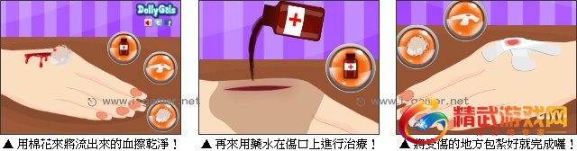 今天凯莉要去指甲彩绘店的路上,发生了交通意外使手受伤了,但手上有这么大的伤口肯定是不能做美甲了,赶紧来帮她治疗吧!首先要用棉花小心将血液擦拭乾净,再来药水倒在伤口上进行治疗,最后将受伤的地方包扎起来就完成所有的疗程啰!