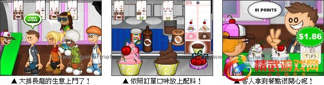 老爹餐饮系列推出新作了,这回他在热闹的街头开了间杯子蛋糕店,上门的顾客非常多,老爹都已经忙不过来了,快来帮他经营蛋糕店吧!游戏开始会先进入练习模式,只要跟着步骤完成点餐,并依照客人的口味烘烤蛋糕,再加上各式果酱与饼乾,就可以出餐了,是不是很有成就感呢!