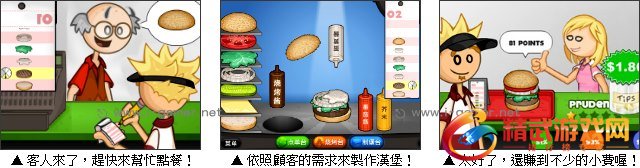 老爹路易系列游戏又来了!在欧美国家,汉堡几乎是每个人都会喜欢的食物,所以老爹这次要经营一家汉堡店,但要如何跟外头众多的连锁餐厅竞争呢?游戏一开始会先进入练习模式,学会了经营和制作独门汉堡的秘诀后,才可以正式开店,如果服务的品质好,还会获得小费喔。