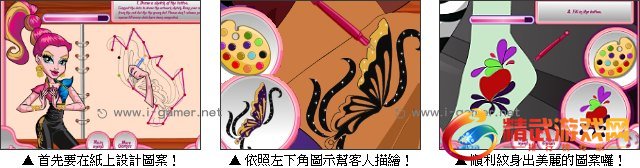 纹身艺术越来越受时下年轻人的欢迎,今天你将扮演一位专业的艺术纹身师,要帮前来光顾的客人设计出完美的刺青图案,并依照跟客人谈话内容来选择适合的图案,再亲手为客人纹上漂亮的刺青喔!