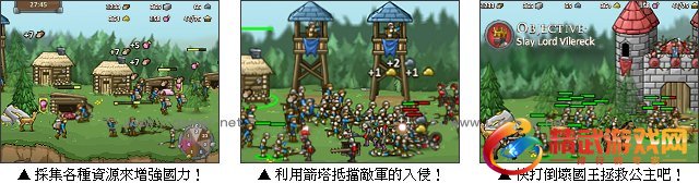 游戏中可以点击农民进行资源採集或建造农场、训练所等建筑来强化自己的军队,邪恶军团每隔数分钟便会派遣士兵攻击,玩家必须在这段时间能不断的成长茁壮,才能抵挡敌人的侵犯,甚至可以主动攻击邪恶军团,取得这场战争的胜利。快来帮忙农民把敌国军团赶出去吧!