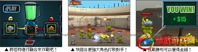 科学博士刚刚获得了一项研究,能够将怪物进行融合,成为强大的怪物来打败对手。游戏中你可以将各种不同的怪物进行融合,来创造更厉害的角色;而打败对手会依经验值得不同,获得不同的奖励金额,赶快来打造属于你的怪物军团吧(每次的组合都必须花费喔50个金币喔)!