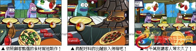 海绵宝宝的比萨店开张了,快来跟海绵宝宝一起制作吧。依照客人所点选的食材配料,配好后放入烤箱就可以将热腾腾的比萨送到客人餐桌前了喔,越到后面客人就会越多,仔细点选千万别配错料啰!